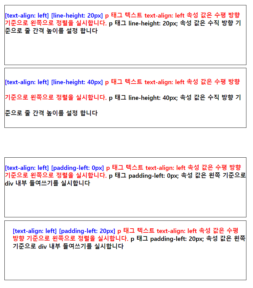 <span style="color: #ff0000;">p 태그 텍스트 text-align: left 속성 값은 수평 방향 기준으로 왼쪽으로 정렬을 실시합니다.</span>