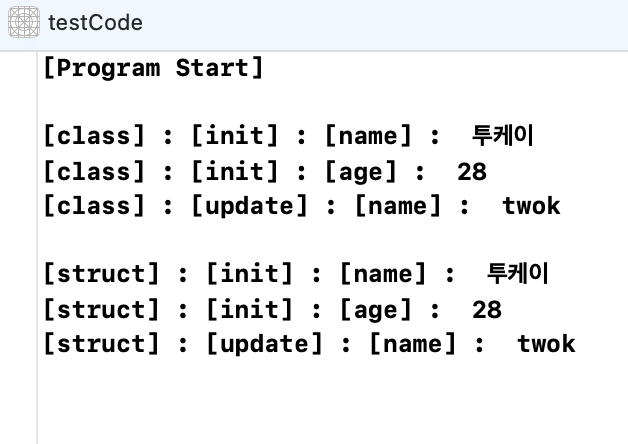 var userStruct = User_Struct(name: "투케이", age: 28) // 구조체 생성자 초기화 값 삽입