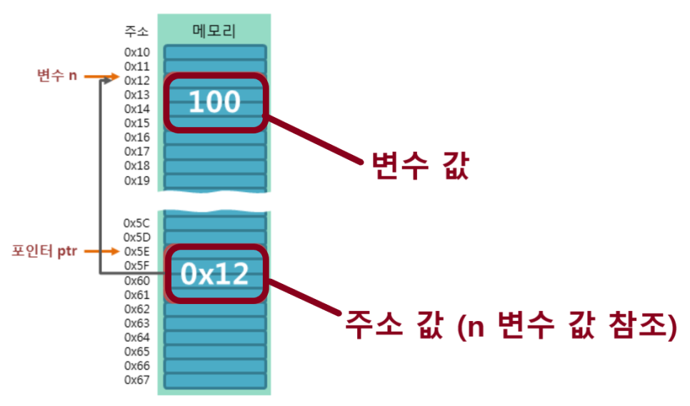 - C언어에서 포인터(pointer)란 메모리의 주소값을 저장하는 변수이며, 포인터 변수라고도 부릅니다