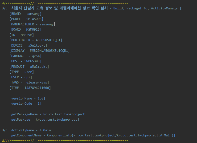 Log.d("","\n"+"[사용자 단말기 고유 정보 및 애플리케이션 정보 확인 실시 - Build, PackageInfo, ActivityManager]");