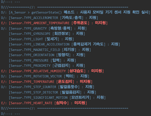 Log.d("","\n"+"[A_Sensor > getSensorState() 메소드 : 사용자 모바일 기기 센서 지원 확인 실시]");