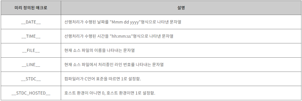 - 미리 정의된 매크로는 #define 선행처리 지시자로 정의하지 않아도 사용할 수 있으나, 사용자가 재정의할 수는 없습니다