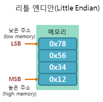 - 리틀 엔디안은 대부분의 인텔 CPU 계열에서는 이 방식으로 데이터를 저장합니다