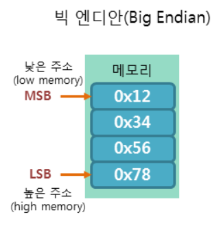 - 빅 엔디안 방식은 낮은 주소에 데이터의 높은 바이트부터 저장하는 방식입니다