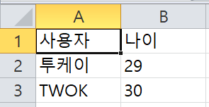 var excelData = [ ['사용자', '나이'], ['투케이', '29'], ['TWOK', '30'] ];