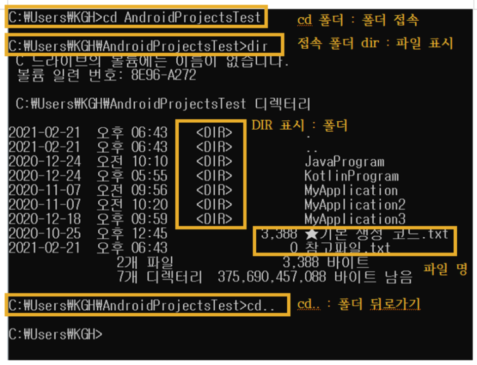 1. cd : 폴더 접속 및 뒤로가기를 수행할 수 있는 명령어입니다