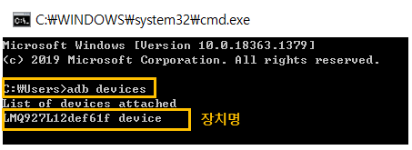 3. cmd 프롬프트 창을 실행 > adb devices 명령어를 입력해 정상적으로 모바일기기가 인식되었는지 확인합니다