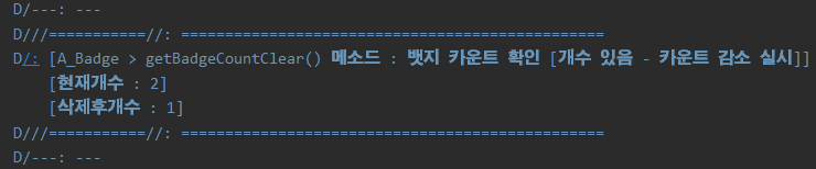 Log.d("","\n"+"[삭제후개수 : "+String.valueOf(Integer.parseInt(saveBadgeCount)-1)+"]");