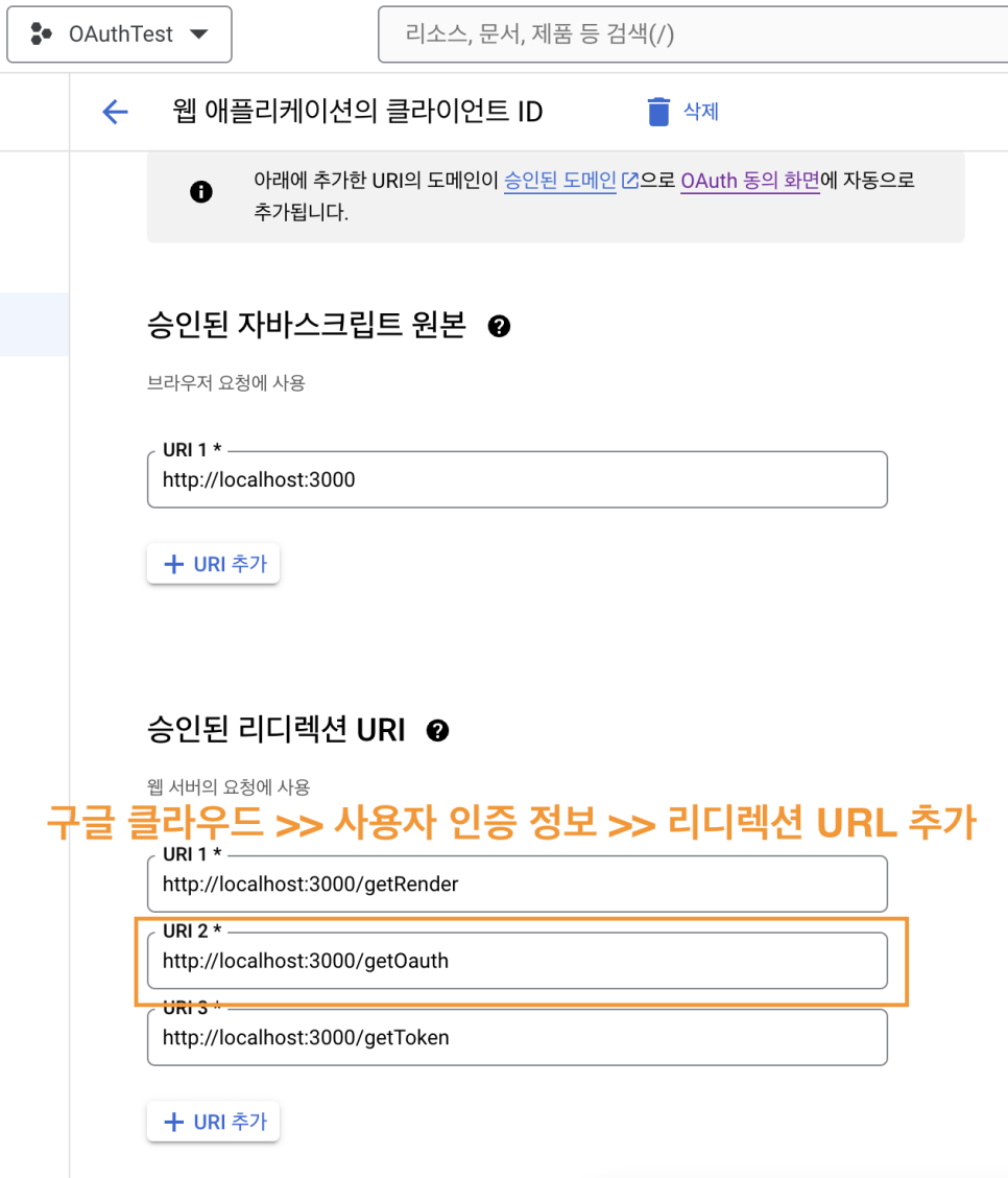 const AUTH_REDIRECT_URL = "http://localhost:3000/getOauth"; // [리다이렉트 주소 : 구글 사용자 인증 정보에 등록 필요]