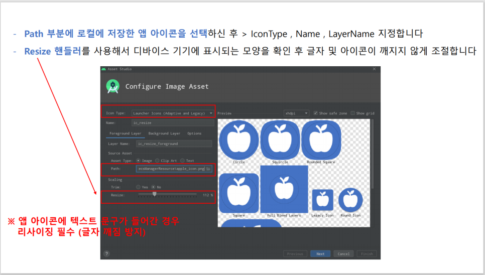 94. (AndroidStudio/android/java) 안드로이드 바탕화면 런처 아이콘 디바이스 기기 환경에 맞게 리사이징 방법 - Image Asset , mipmap