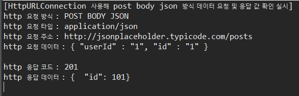 System.out.println("[HttpURLConnection 사용해 post body json 방식 데이터 요청 및 응답 값 확인 실시]");