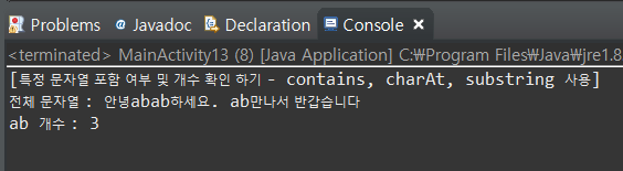 System.out.println("[특정 문자열 포함 여부 및 개수 확인 하기 - contains, charAt, substring 사용]");