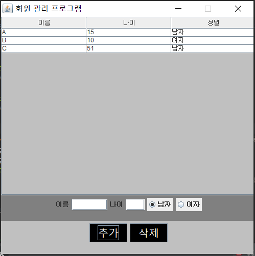199. (java/자바) GUI (awt/swing) - 회원 관리 프로그램 만들기 (DefaultTableModel , JTable , JScrollPane) 본문