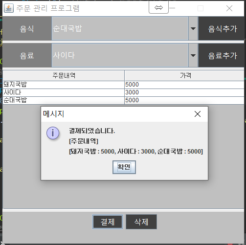 else if(e.getActionCommand().equals("결제")) { // 결제 버튼 클릭이벤트 처리