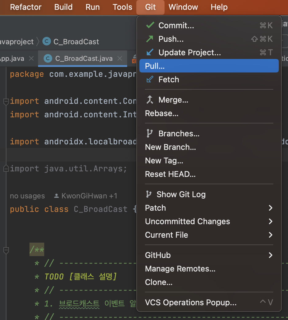 1. 안드로이드 스튜디오에서 [ 상단 메뉴 >> Git >> Pull ] 메뉴 선택