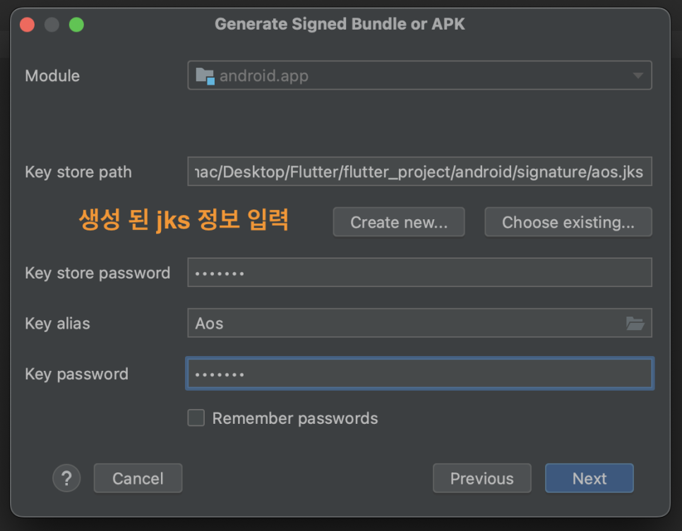 Key store path : <JKS 파일이 저장 될 위치 지정> >> jks 명칭도 지정