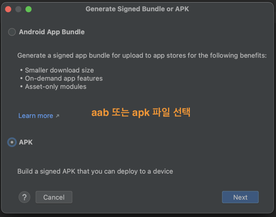 3. 생성할 Release 모드 선택 수행 [Android App Bundle , APK] >> [Next] 버튼 클릭
