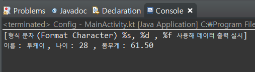 | 54. (kotlin/코틀린) 형식 문자 (Format Character) %s, %d , %f 사용해 데이터 출력 실시 (0) | 2021.04.26 |