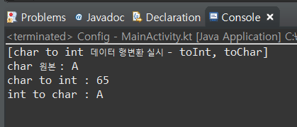 println("[char to int 데이터 형변환 실시 - toInt, toChar]")