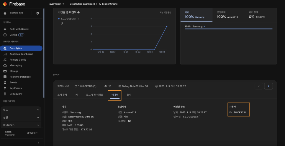 929. (Android/Java) 파어베이스 크래시 리틱스 Firebase Crashlytics 에러 발생 추적 위한 setUserId 사용자 아이디 값 추가 실시