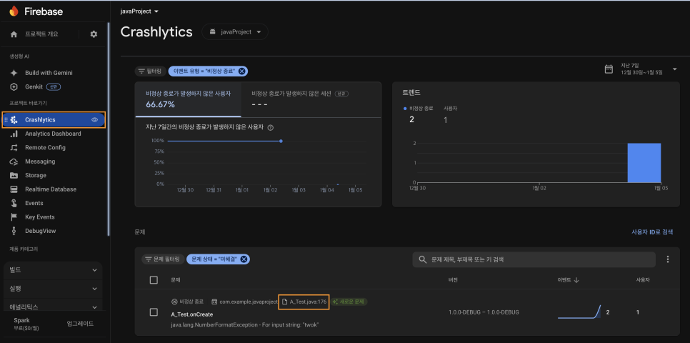 * 1) 파이어베이스 콘솔에서 앱 사용 중 에러가 발생해 Kill 된 경우 해당 로그를 추적해서 어디에서 다운이 되었는지 확인 수행