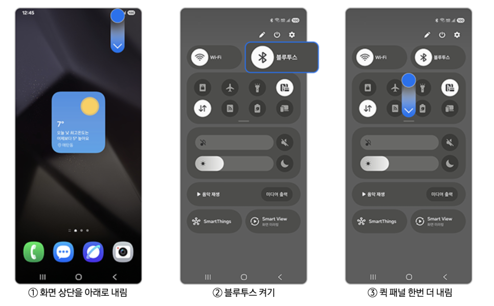 >> 블루투스를 켠 후 퀵 패널을 한번 더 내려 확장하세요.