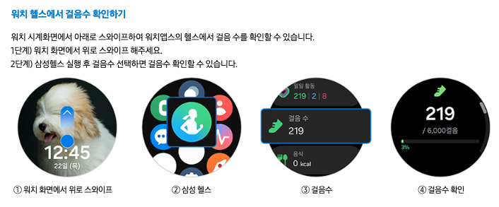 1. 워치 시계화면에서 아래로 스와이프하여 워치앱스의 헬스에서 걸음 수를 확인할 수 있습니다.