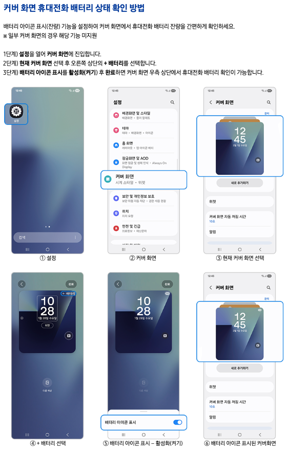 3. [배터리 아이콘 표시] 를 활성화 (켜기) 후 완료하면 커버 화면 우측 상단에서 휴대전화 배터리 확인이 가능합니다.