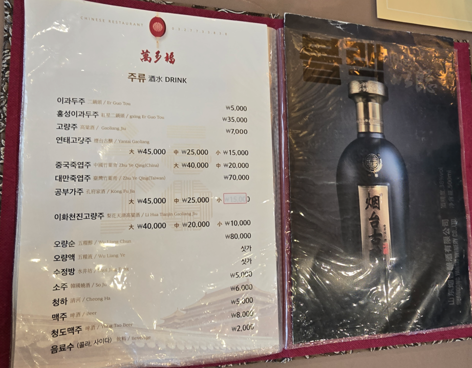 6. 지인과 같이 방문해서 각각 백짜장면과 백짬뽕 그리고 동파육을 시켰습니다. (맛있는 음식에 술이 빠질 수 없기에 고량주도 시켜서 먹었습니다 ㅎㅎ)